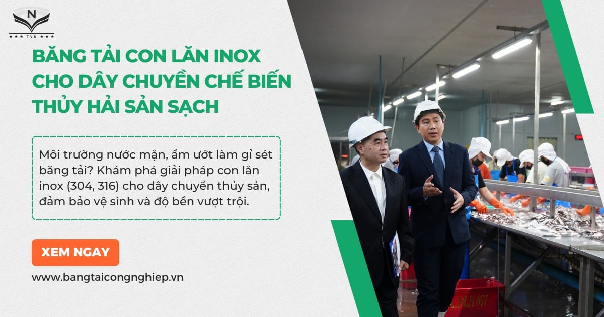 Môi trường ẩm ướt, muối mặn, yêu cầu vệ sinh khắt khe và tẩy rửa liên tục là những thách thức đặc thù của ngành chế biến thủy hải sản. Trong điều kiện đó, việc lựa chọn một hệ thống băng tải phù hợp không chỉ ảnh hưởng đến hiệu suất mà còn quyết định đến chất lượng và an toàn của sản phẩm. Bài viết này từ Xưởng Cơ Khí TVN sẽ phân tích tại sao băng tải con lăn inox không phải là một lựa chọn, mà là một yêu cầu bắt buộc cho ngành này.